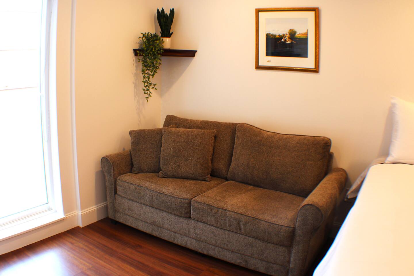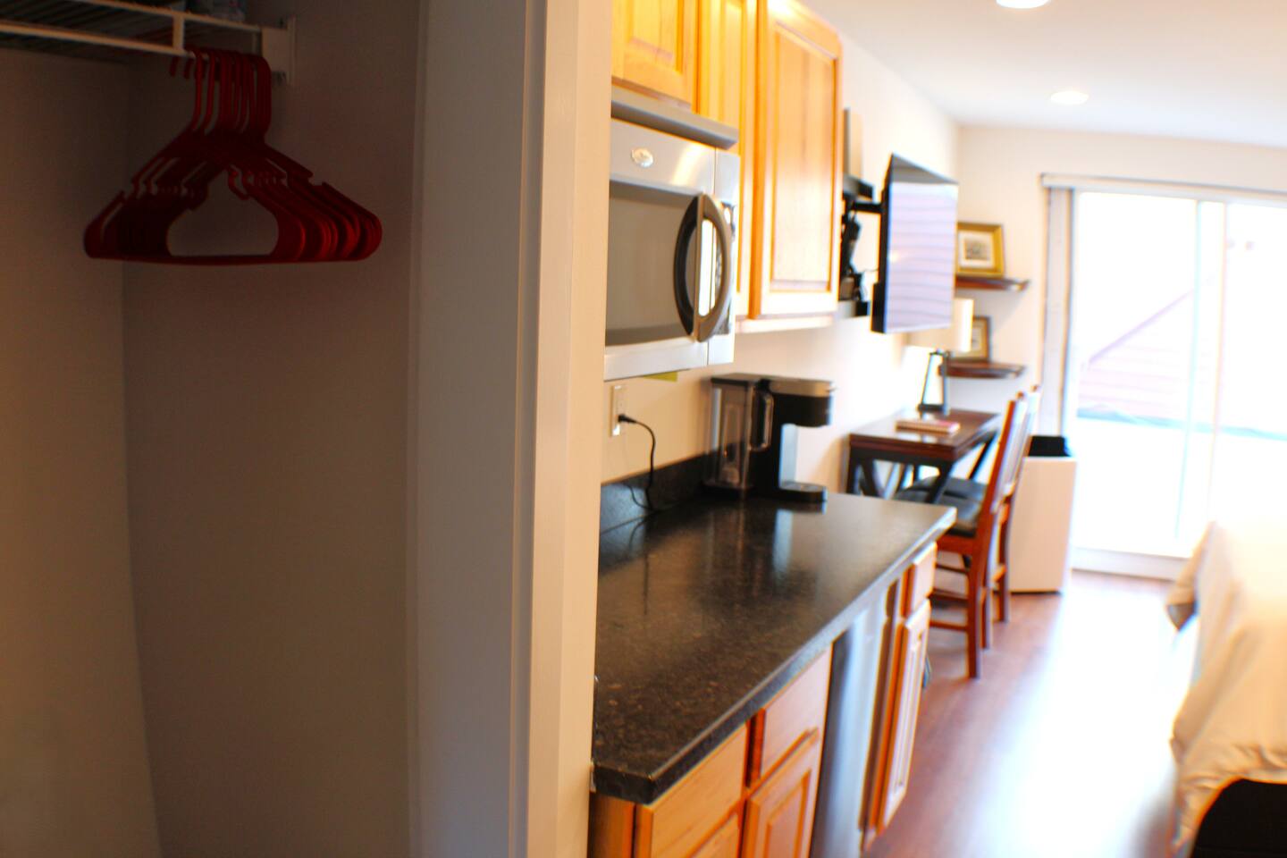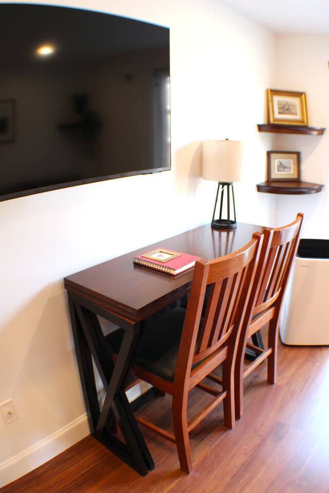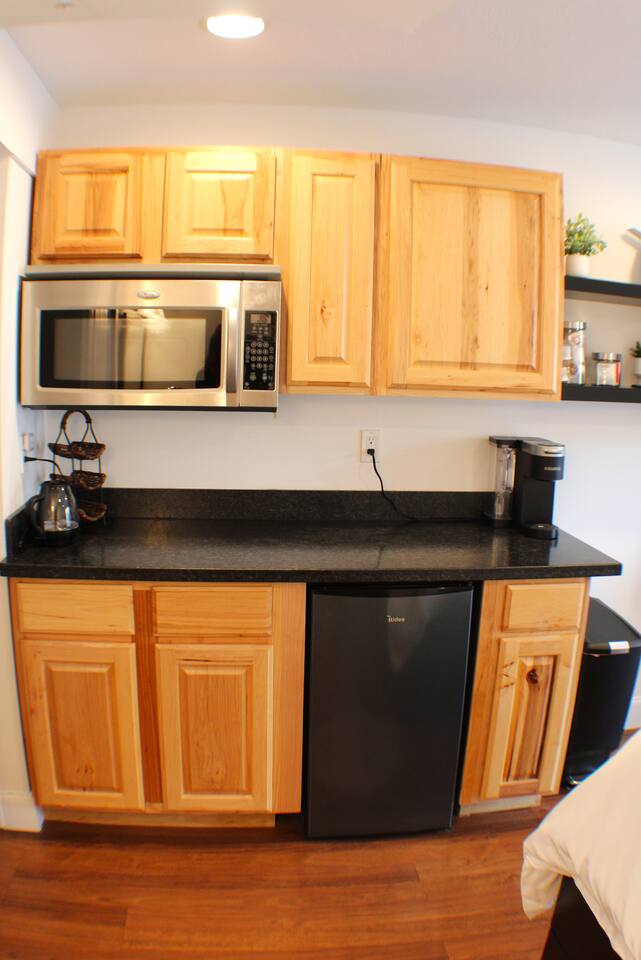 This cozy studio offers everything you need for a comfortable stay. The open layout features a queen-size bed, seating area, and a small kitchenette with a microwave and mini-fridge. The private bathroom includes a shower, fresh towels, and essential toiletries. Perfect for solo travelers or couples, the space is designed for convenience and relaxation, making it a great home base for exploring the area.